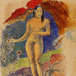 Vivir en el pueblo de Mataiea en Tahití , pintó Fatata te Miti ("By the Sea"), "Ia Orana Maria "(" Ave María "), y otras representaciones de la vida de Tahití. En 1893 Gauguin regresó a Francia, donde pintó Mahana ningún Atua ("Día de Dios", 1894). tahitiano que representaba la religión, a pesar de que el ídolo en el centro, Hina, se deriva más de los arquetipos y el sudeste de Asia india Huts, montañas, bailarines, un flautista y otros recuerdos de la vida polinesia forman el escenario para el sujeto en primer plano de cada tres mujeres en el borde de una piscina. Sus colores ilógicas que la piscina parece abstracto, su profundidad aparente que evoca una especie de simbolismo: La mujer cuyo dedos de los pies toquen el agua en el lado izquierdo de la piscina representa el nacimiento, la figura en el centro, que está sentado en posición vertical con los dos pies en el agua, representa la vida,. mientras que la figura de la derecha representa la muerte dando la espalda a la piscina  Se trasladó a Punaauia en 1897, donde creó la obra maestra " ¿De dónde venimos? ¿Quienes somos? ¿Adónde vamos? " y vivió el resto de su vida en la Islas Marquesas , regresando a Francia sólo una vez, cuando pintó en Pont-Aven .